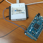 3주차 - (2) 아두이노 →랩뷰 AD/DA 변환 하드웨어 세팅 : NI-6008, 아두이노 DUE, 전선 - NI-6008과 아두이노를 컴퓨터에 연결한다. - NI-6008의 AI3(-)와 아두이노의 디지털 입력 포트(44)를 전선으로 연결한다. 소프트웨어 세팅 - 아두이노는 사인 함수를 지원하지 않기 때문에 따로 싸인 함수 값을 가지고 있는 배열을 선언해준다. - 아두이노 DUE의 DAC1을 출력으로 둔다. 아두이노 DUE의 DAC는 12비트의 분해능을 가진다. - 12비트의 분해능으로 아날로그 값을 출력하는 코드를 작성한다. 아두이노 DUE의 경우, 정격 전압은 3.3V이지만 출력되는 전압에는 보드 자체에서 1/6의 오프셋이 있어 1/6~5/6의 값만을 출력한다. - 랩뷰에서, DAQ 어시스턴트로 ..